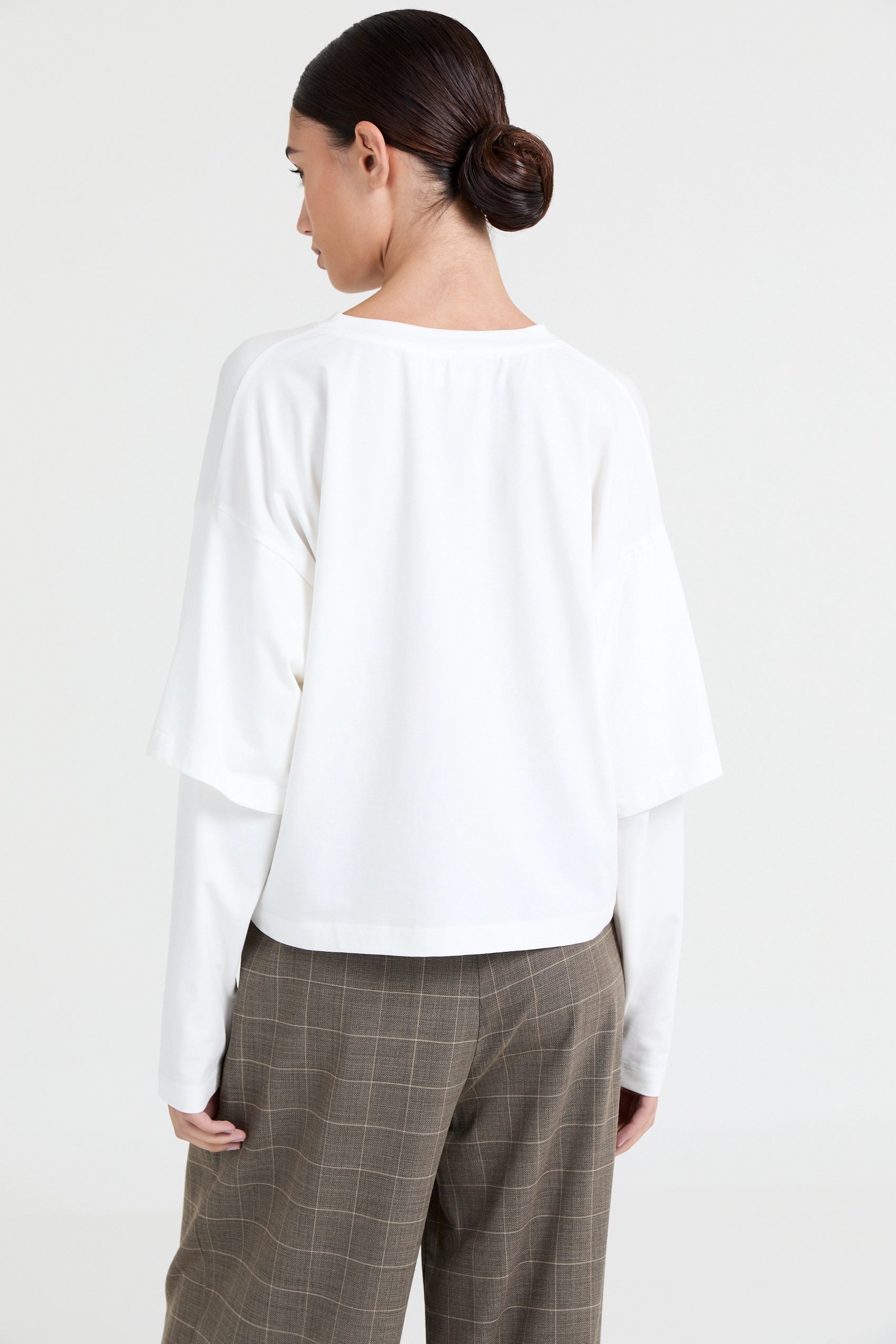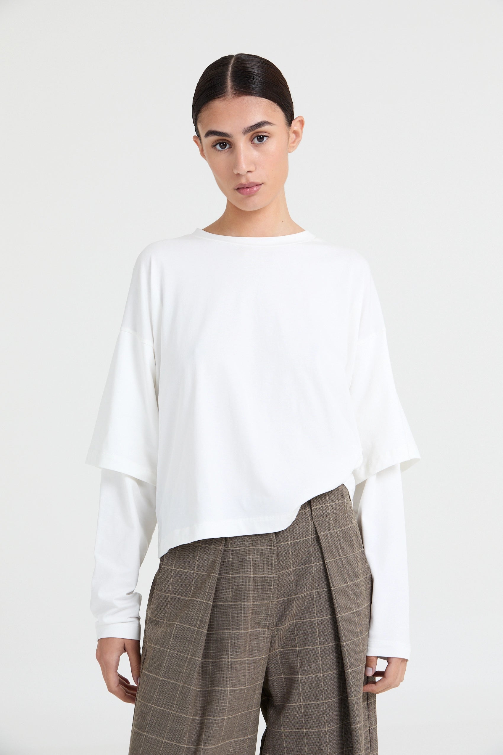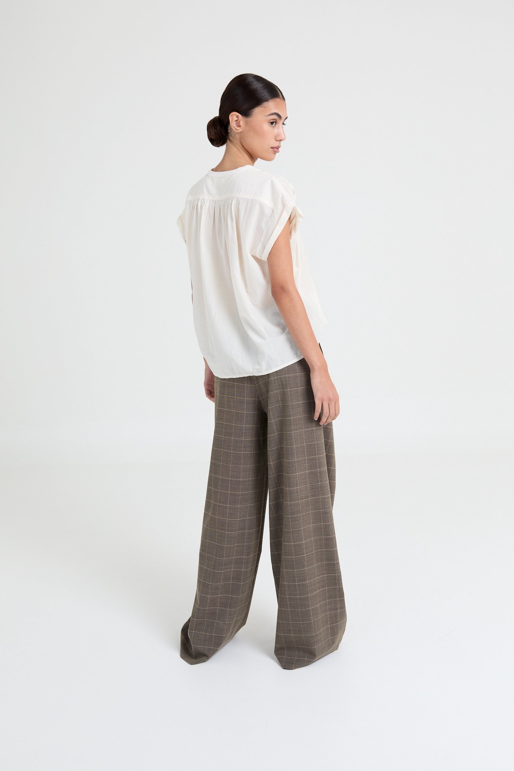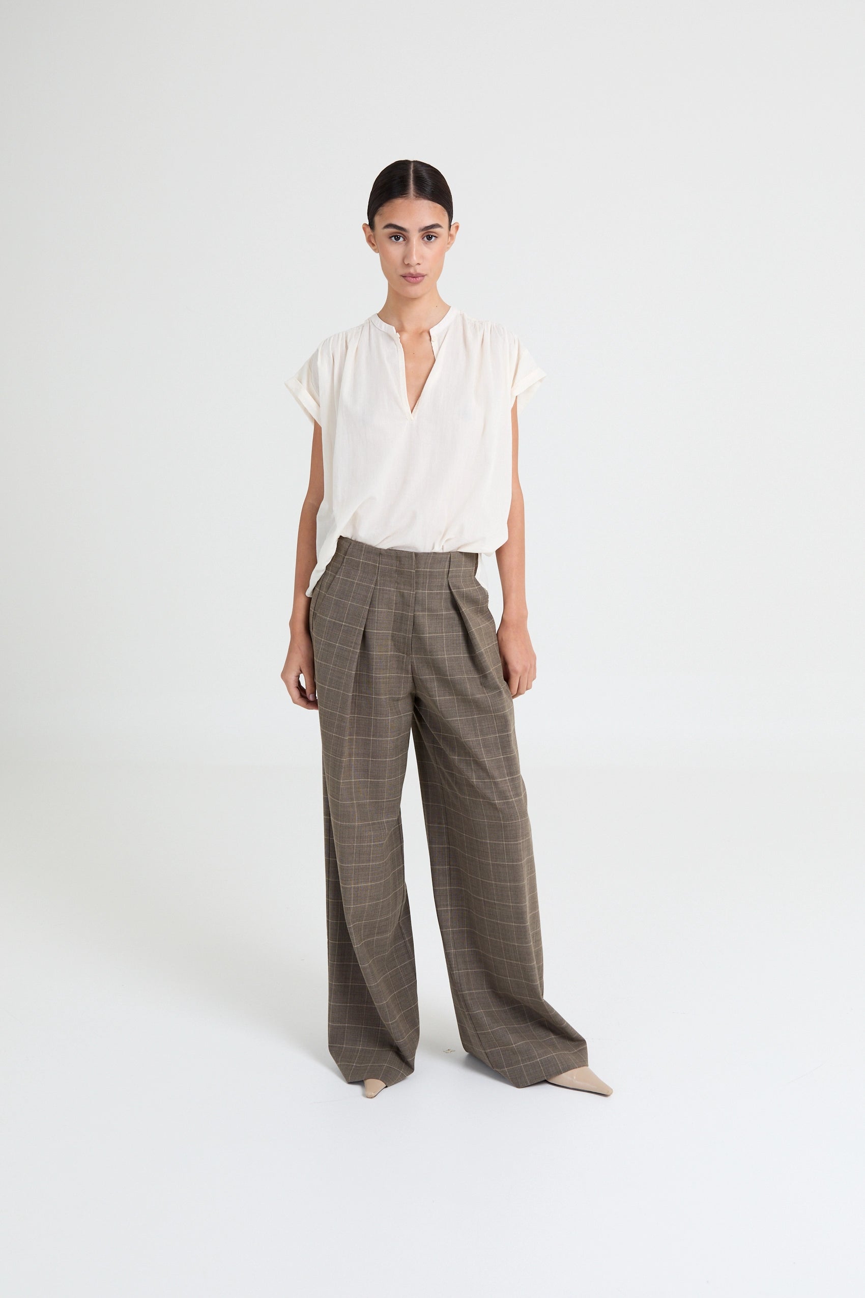 Tailored wide-leg trousers that are crafted from a slightly structured woolblend fabric with a subtle stone grey check. Designed with an invisible high waistband and deep front pleats, they create a fluid yet defined silhouette. The elongated leg falls effortlessly to the floor, creating a refined essential that transitions seamlessly from modern daywear to elevated evening looks.