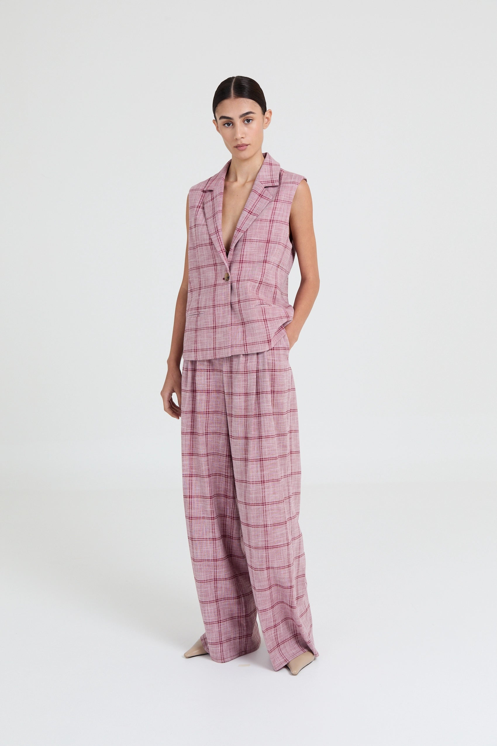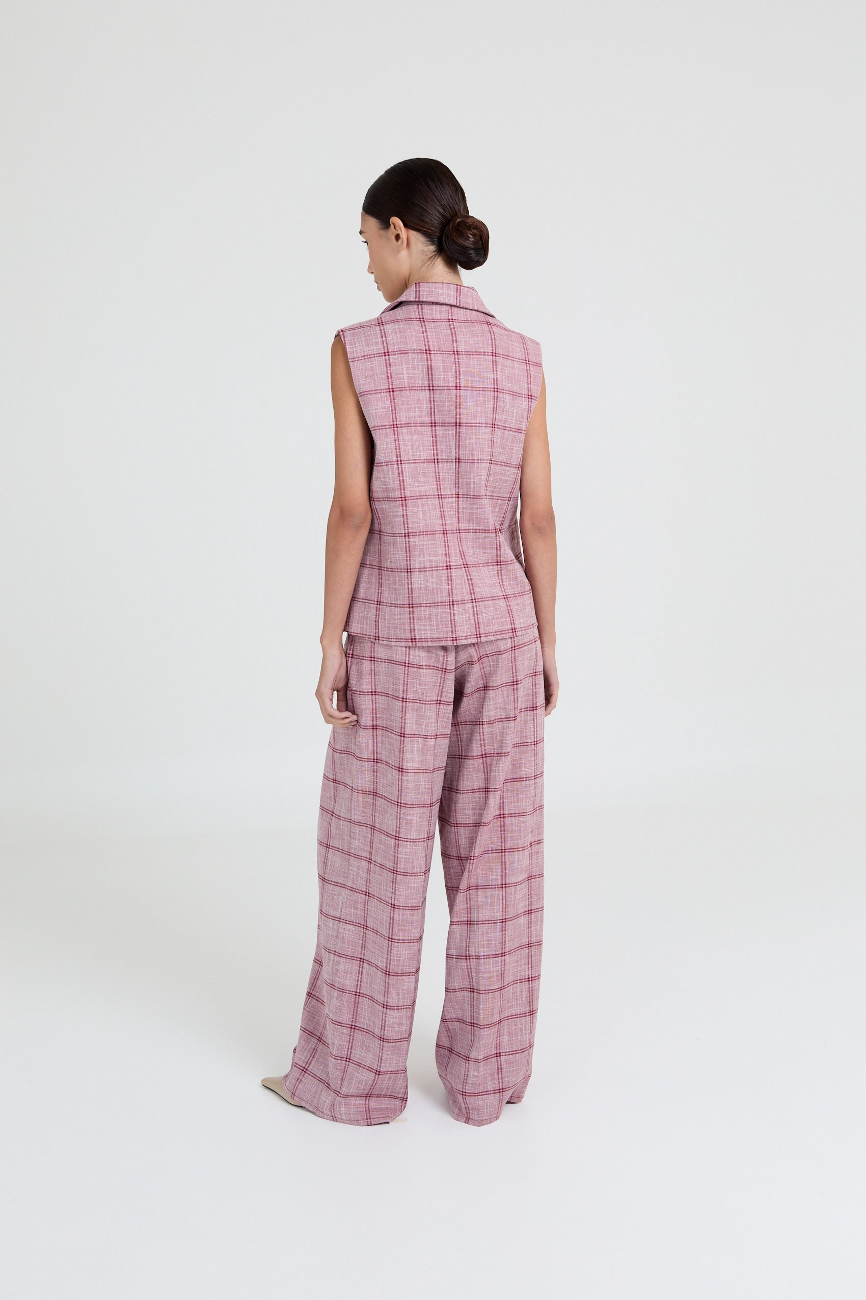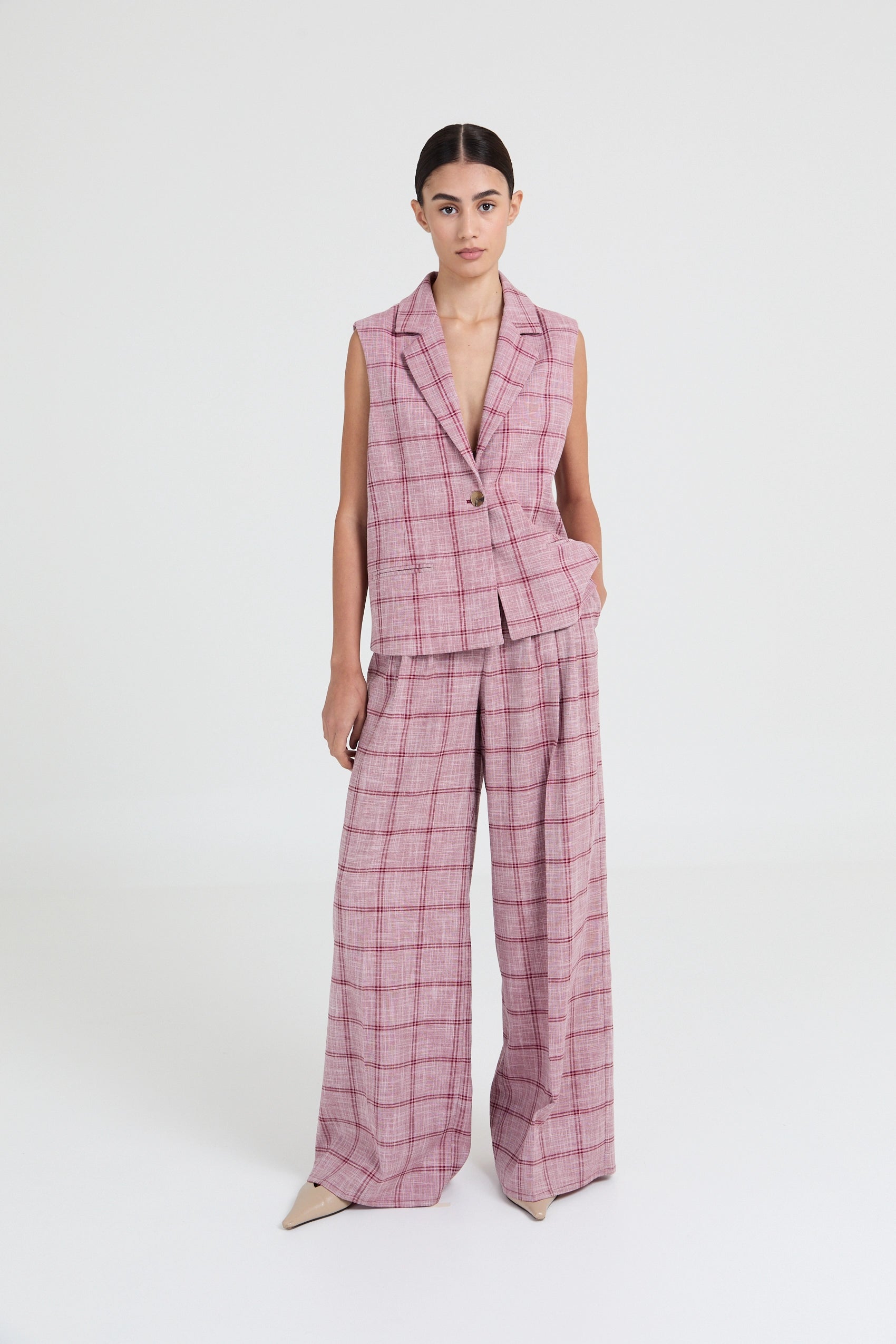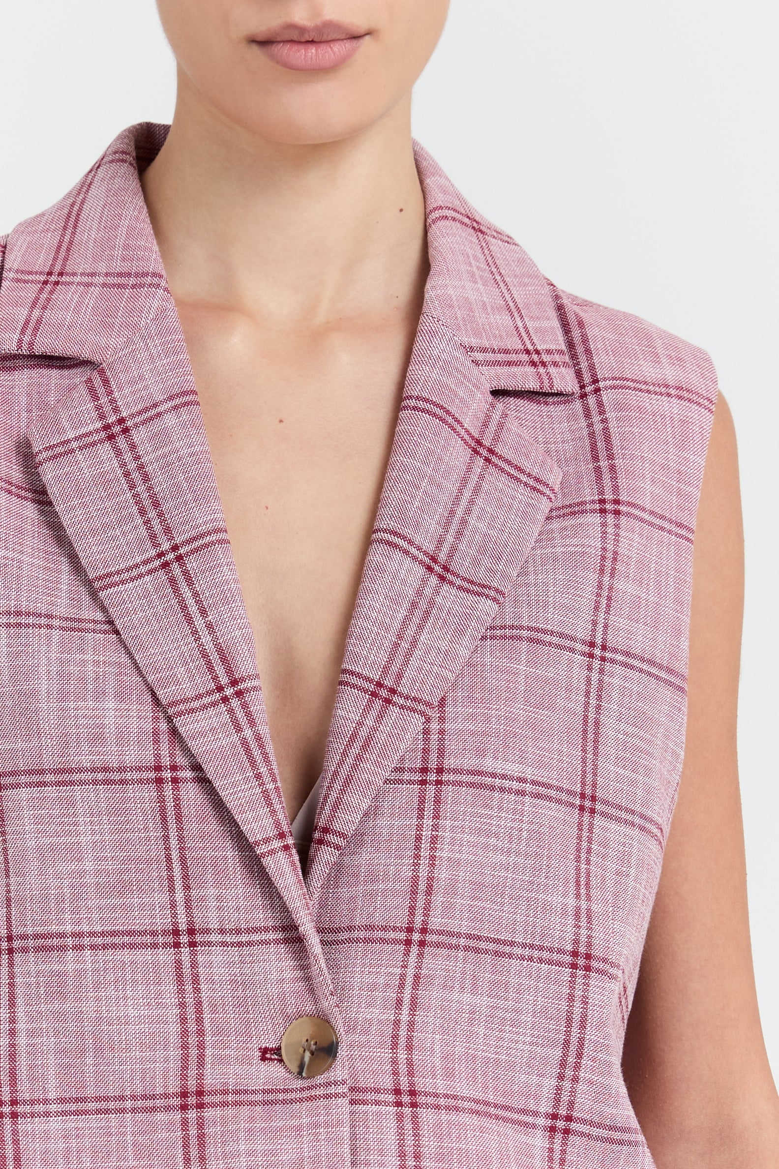 Tailored sleeveless harper blazer crafted from a lightweight cotton-blend fabric with a signature check pattern. Designed with a straight fit, notched lapels and a single-button front closure. Finished with discreet welt pockets and a clean V-shaped neckline. A versatile tailoring piece that can be worn on its own or layered as part of a coordinated suit.