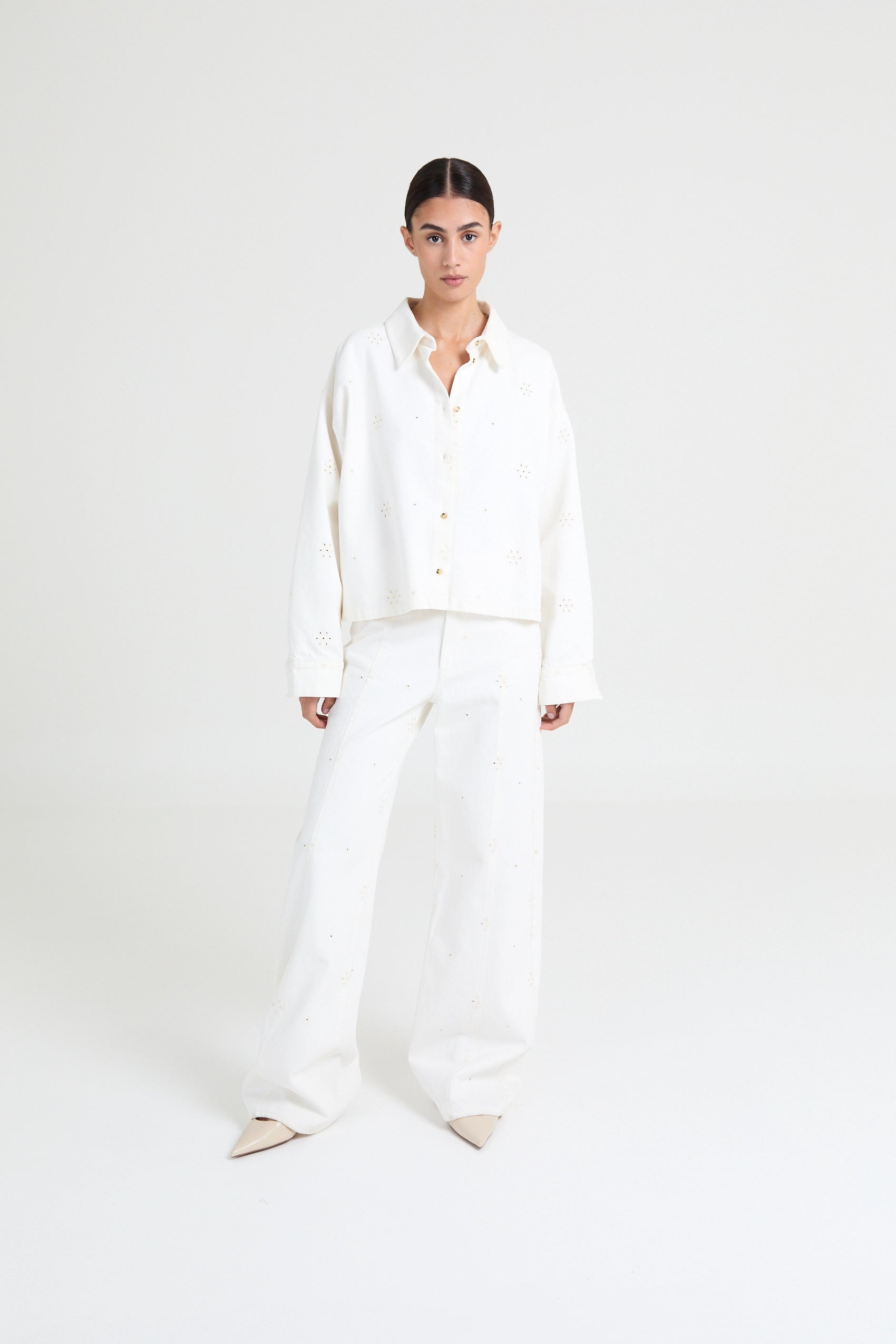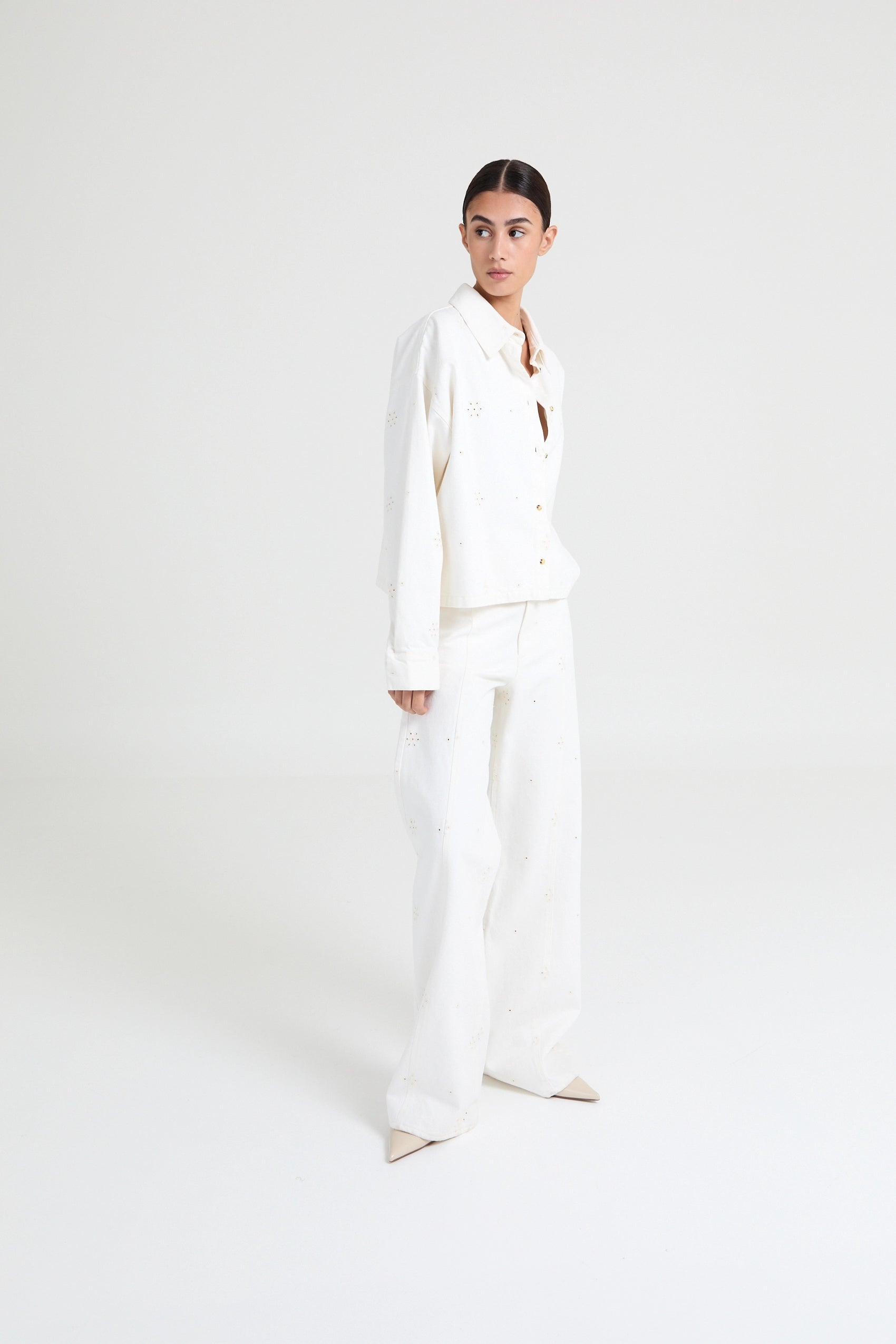 Wide-leg embroidered pants featuring a front stitch and a relaxed silhouette for an elevated yet effortless fit.