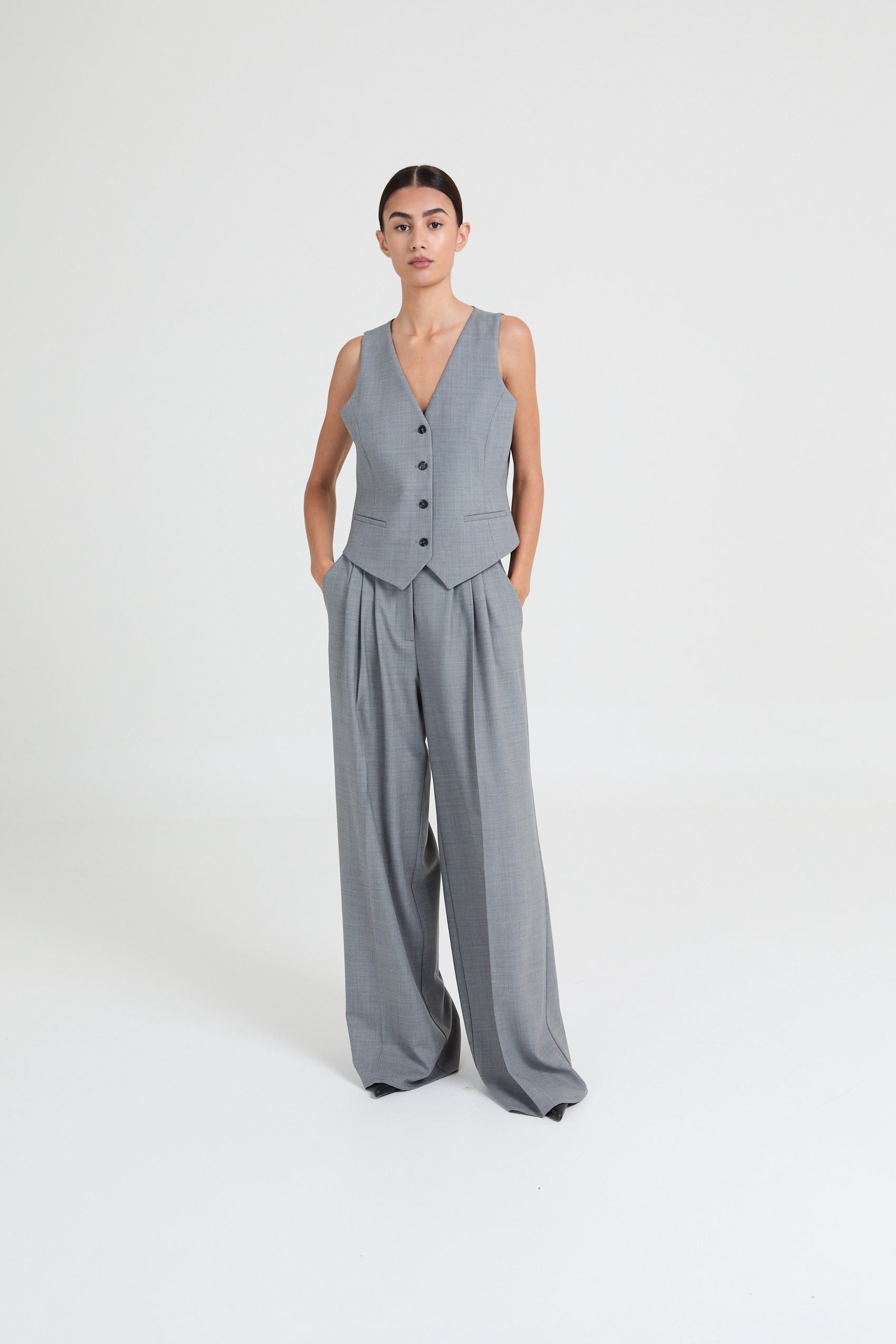 Tailored waistcoat made from a softly structured wool-blend fabric with a subtle melange finish. Cut for a close fit, featuring a clean V-neckline and a buttoned front.