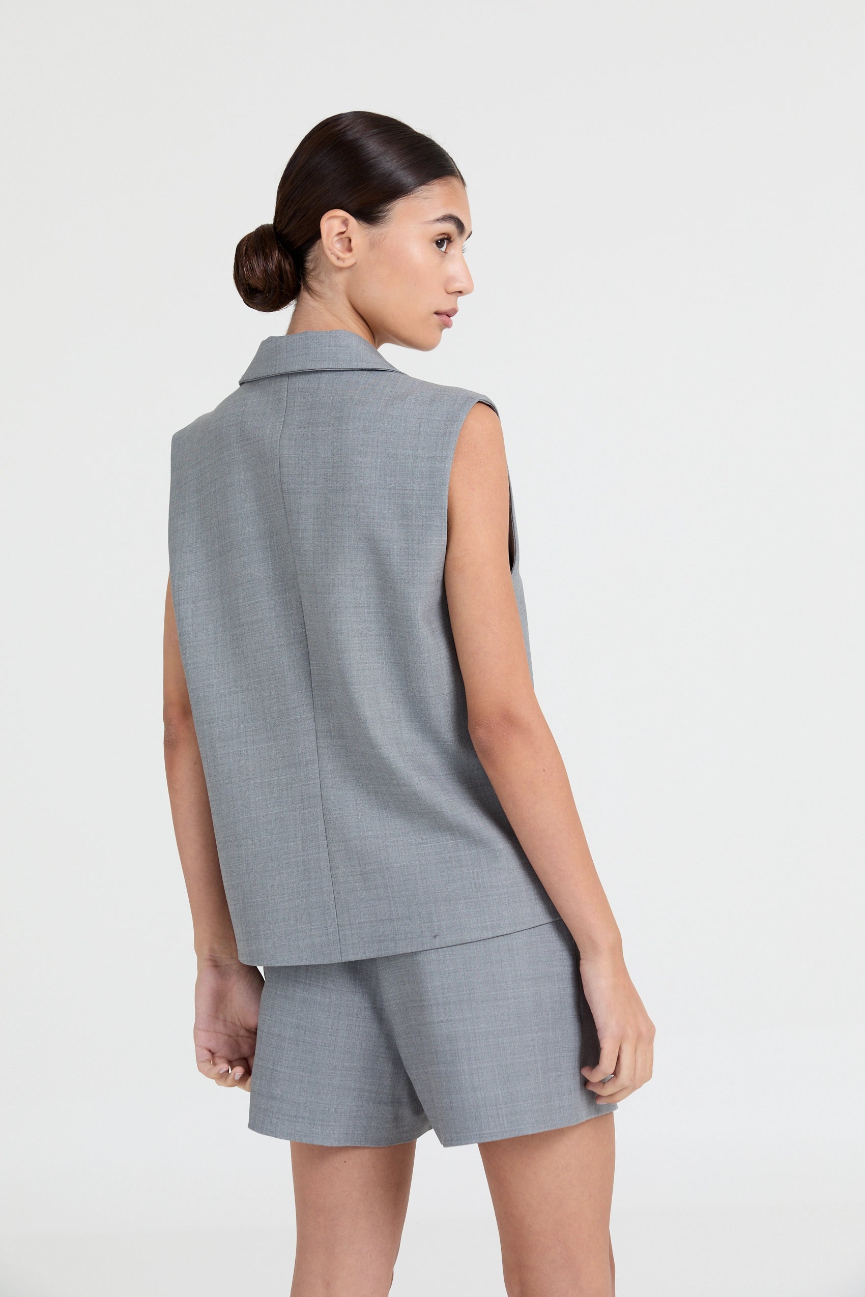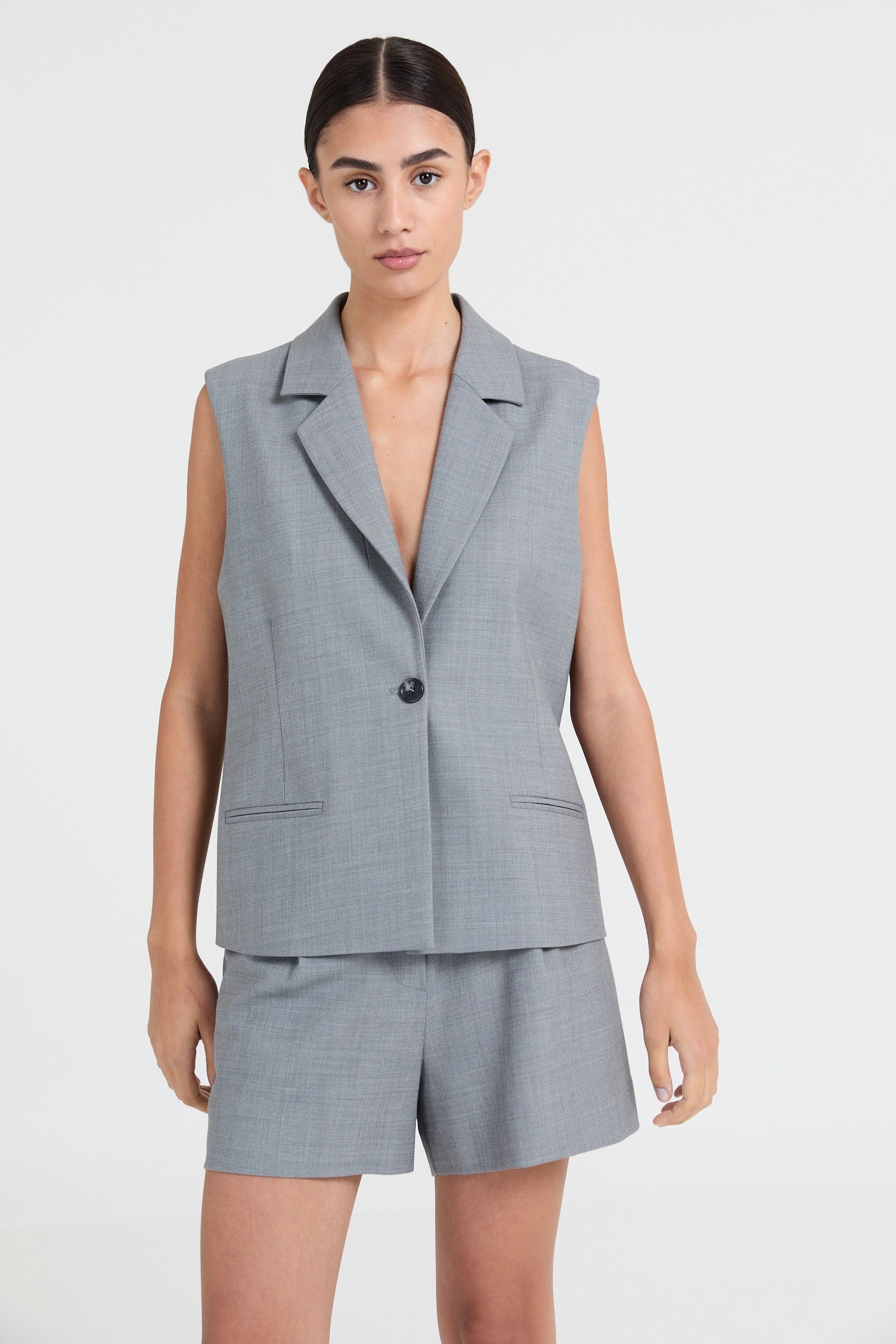 Tailored shorts crafted from a softly structured wool-blend fabric with a subtle melange finish. Designed with a classic trouser waistband and a clean, straight fit. The mid-length design offers a balanced proportion with a tailored feel. A playful tailoring piece suited for coordinated suiting or polished standalone wear.