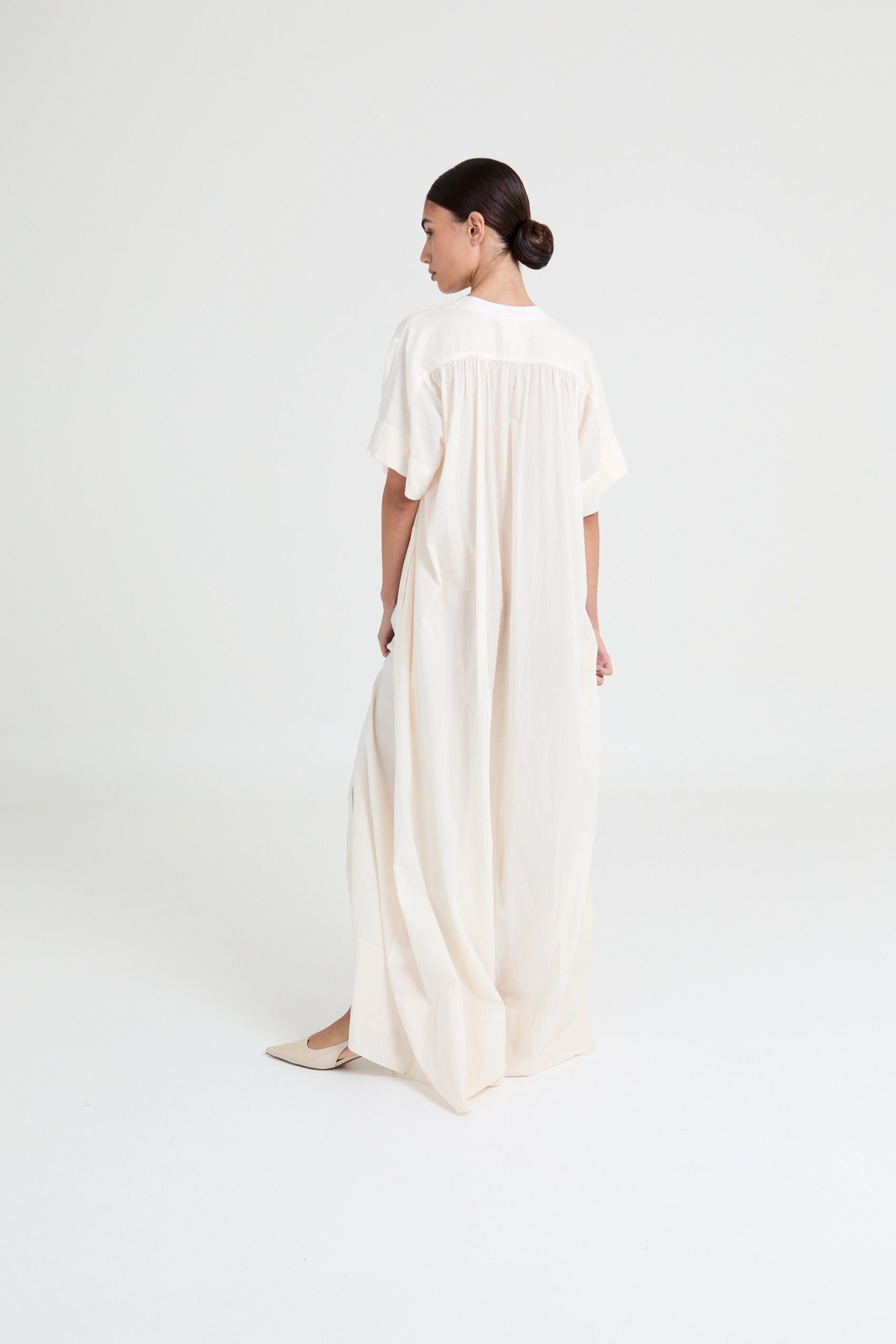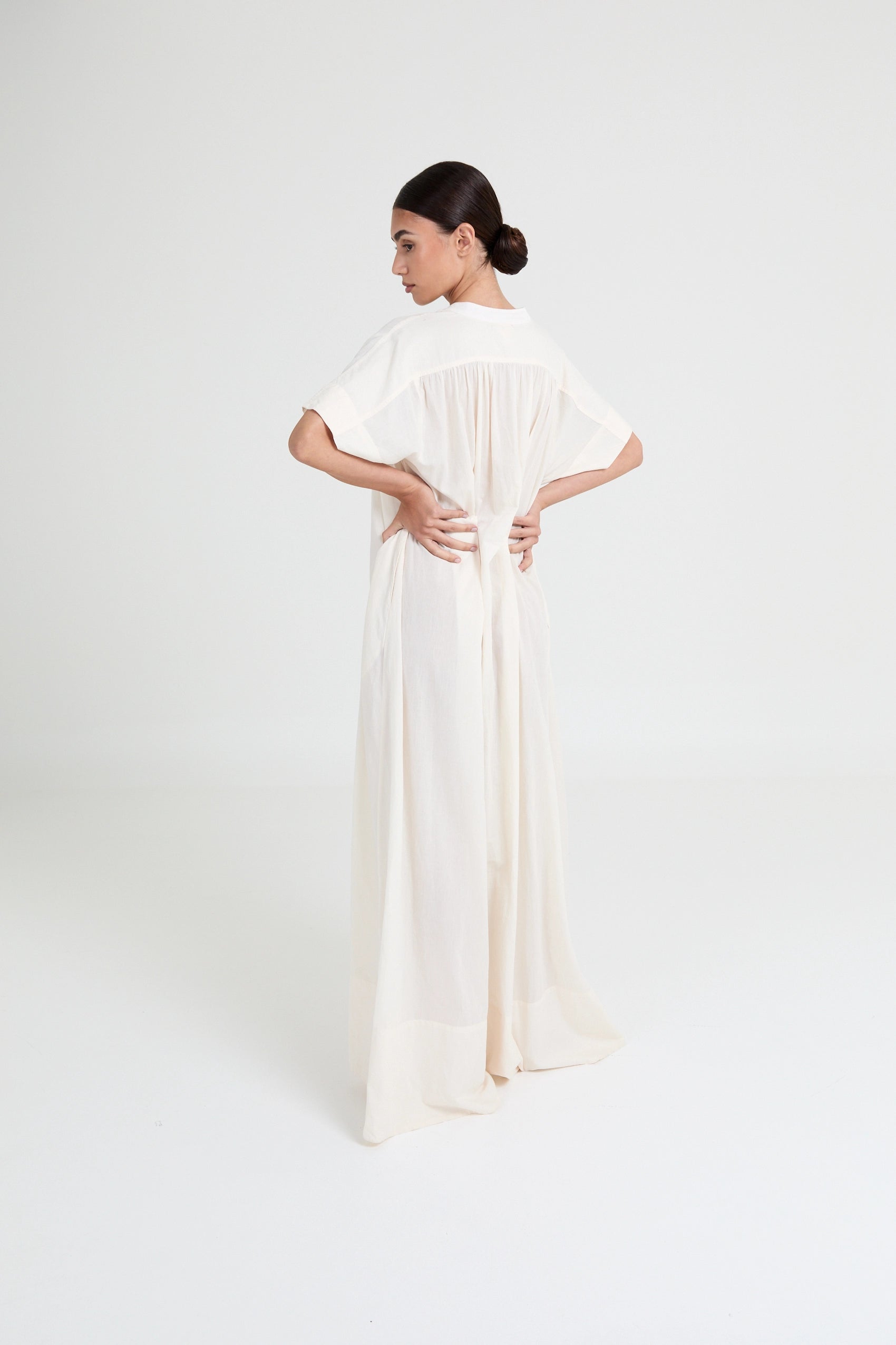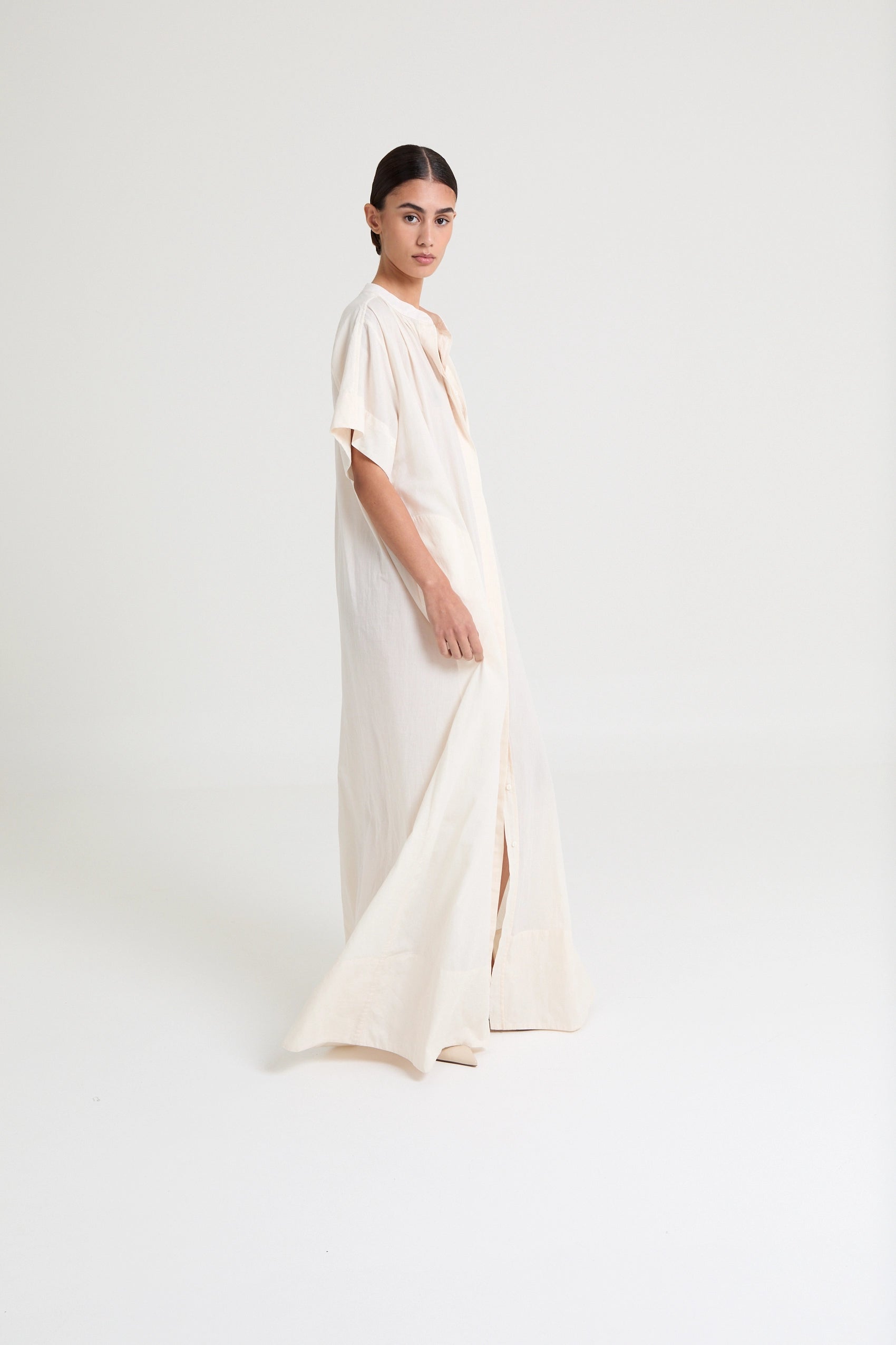Minimal cotton voile dress featuring a fluid drape, subtle volume, and elongated silhouette. An effortless statement in refined simplicity.