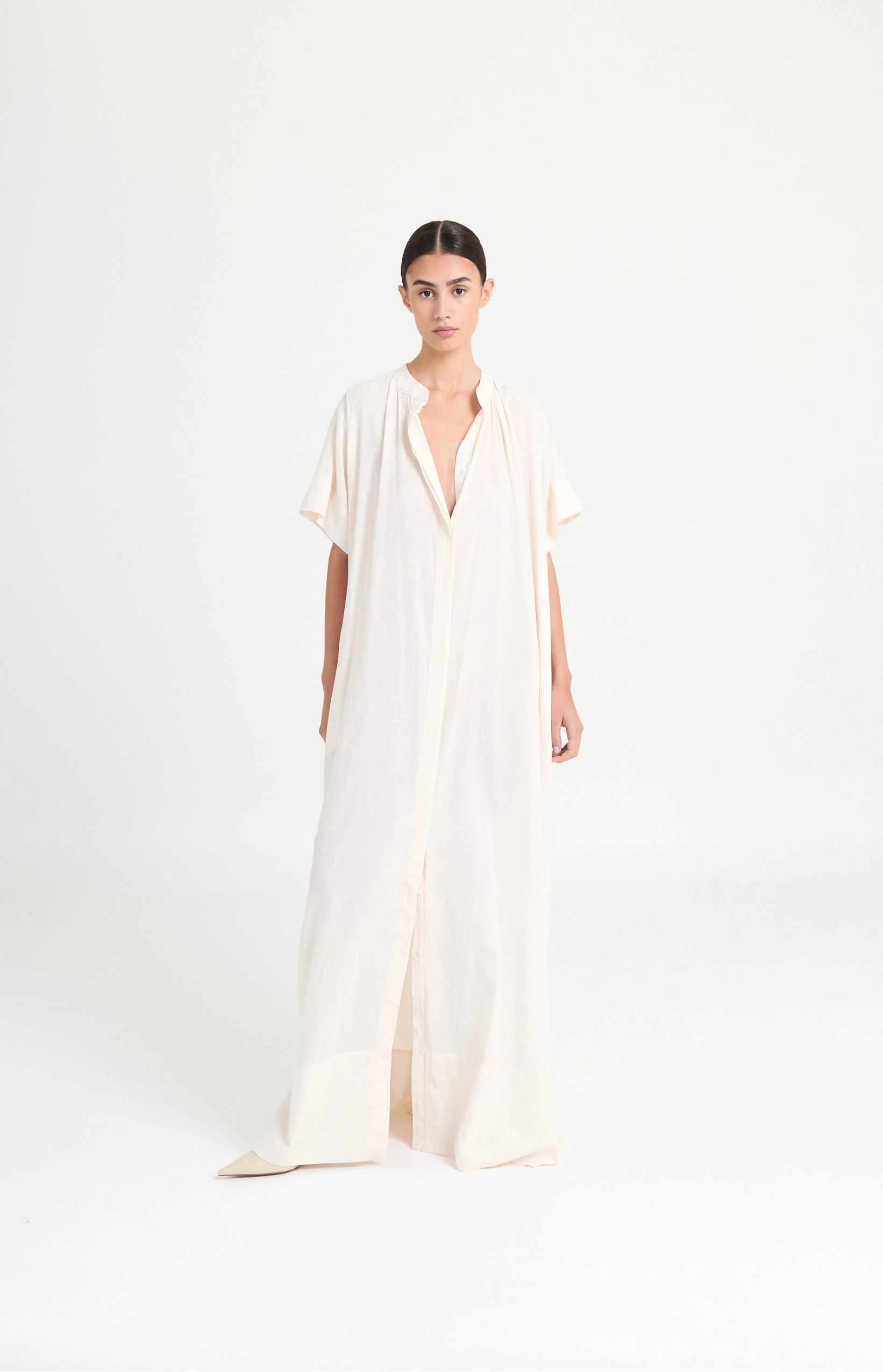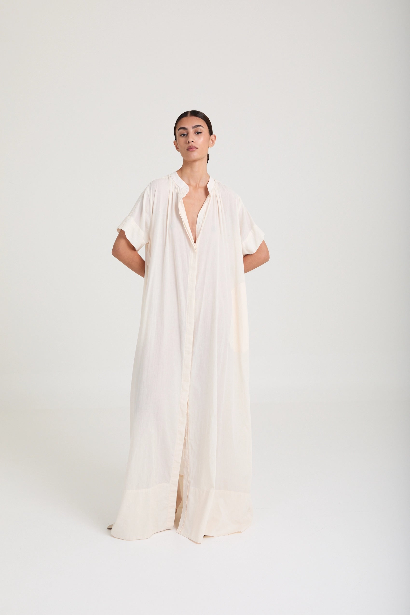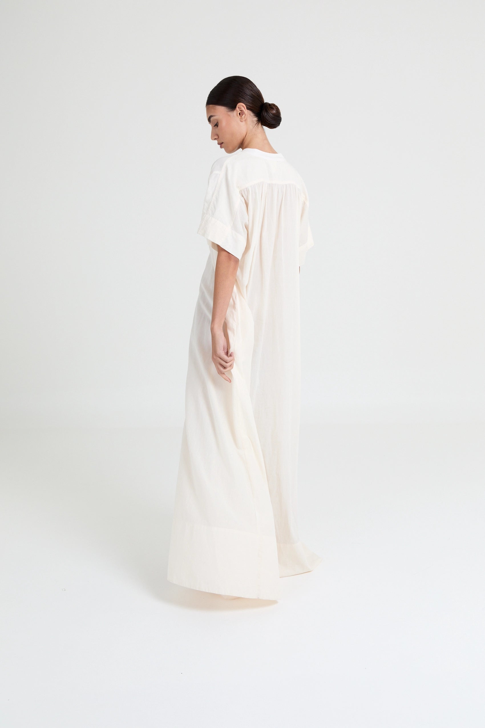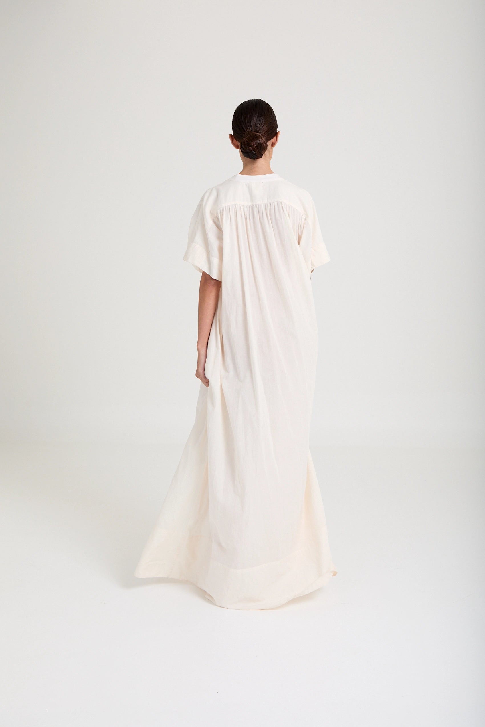 Minimal cotton voile dress featuring a fluid drape, subtle volume, and elongated silhouette. An effortless statement in refined simplicity.