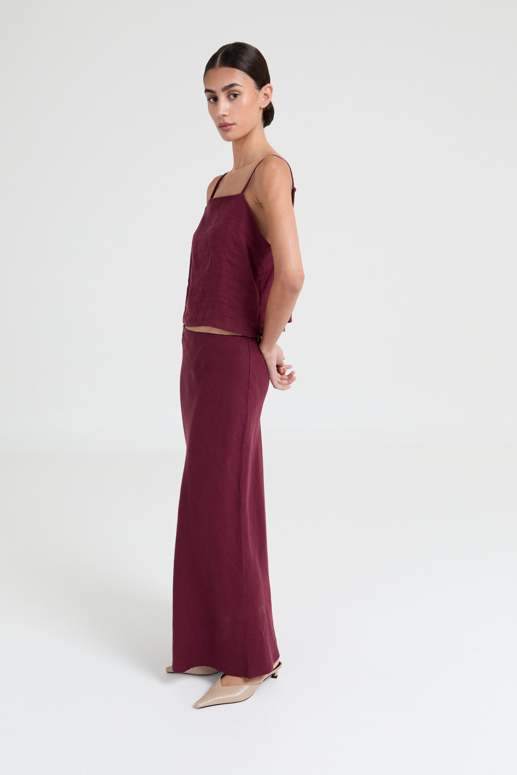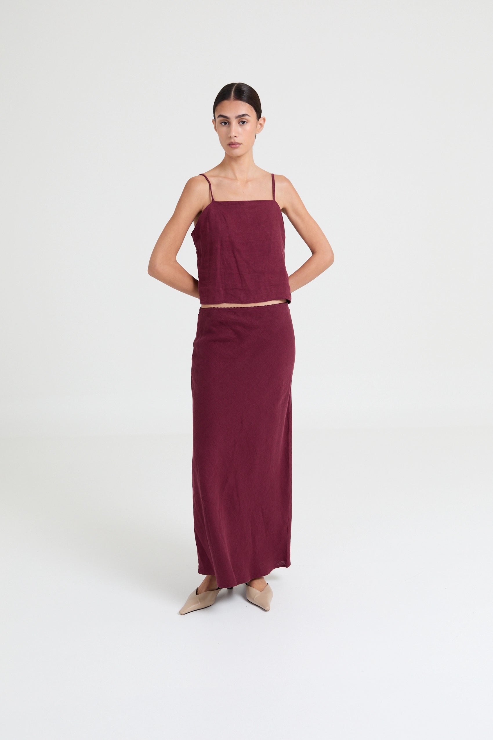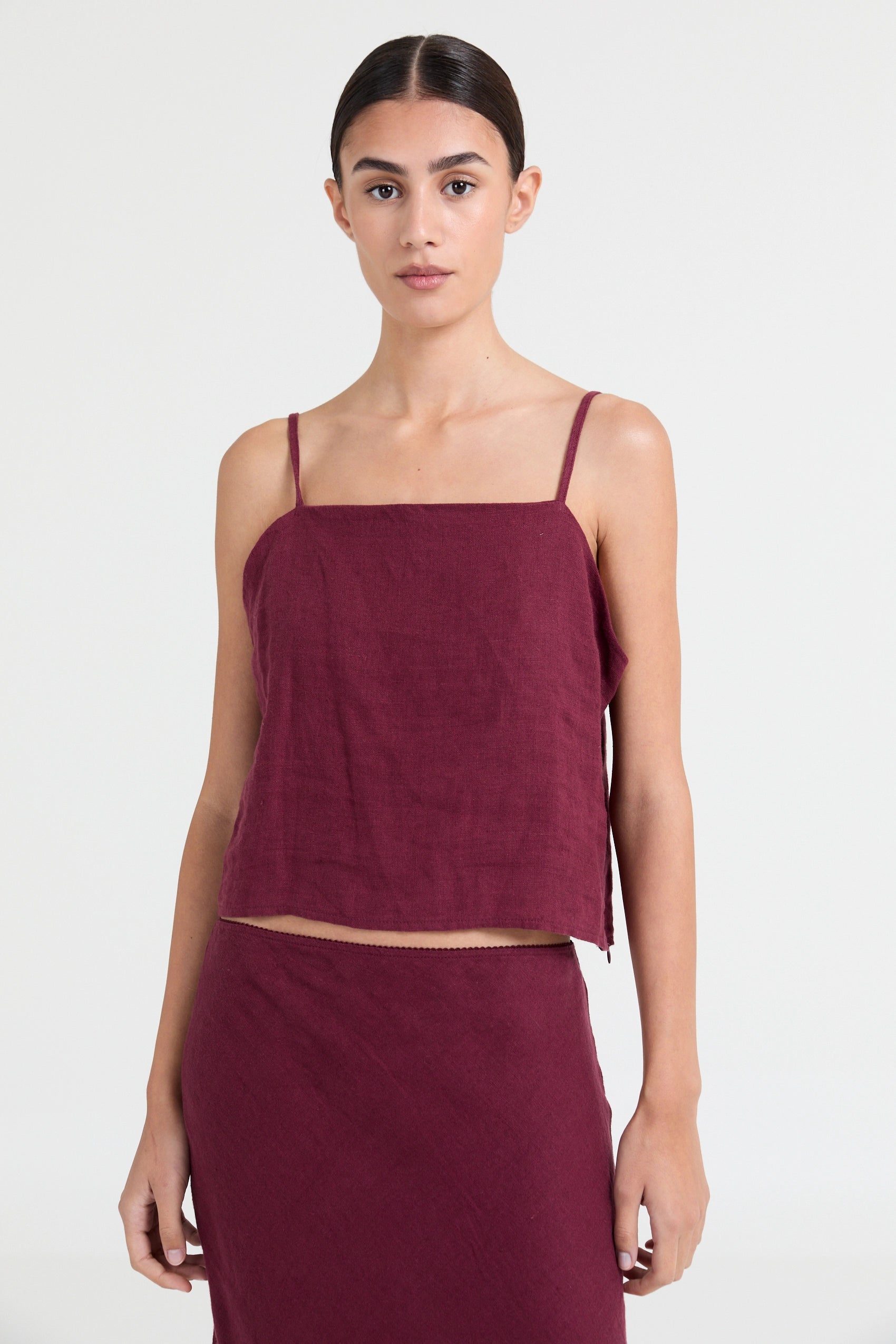 Cropped linen cami top, designed with delicate spaghetti straps that create a flattering, versatile look perfect for layering or wearing solo.